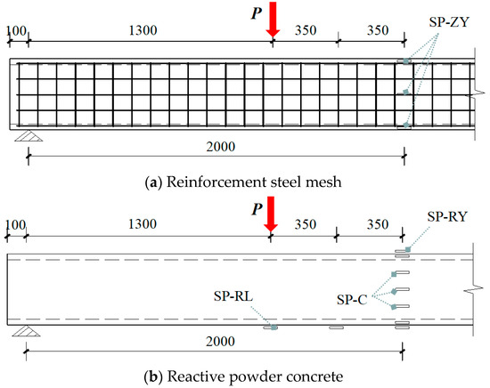 The initial load level of SRFB2 was set to 0%. The reinforcement was carried out directly after the fabrication and curing of the original members, and the bending test was carried out after the thin layer of reactive powder concrete reached the design strength. SFRB3, SRFB4, and SRFB5 were load-holding reinforced after applying up to 50% of the computed ultimate load capacity of the original member. A secondary force test was carried out after the thin layer of reactive powder concrete reached the design strength. The initial load level of SRFB6 was further increased to 80% before the load-holding reinforcement. The parameters of each specimen are shown in Table 1.