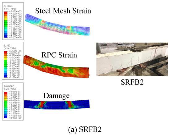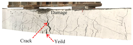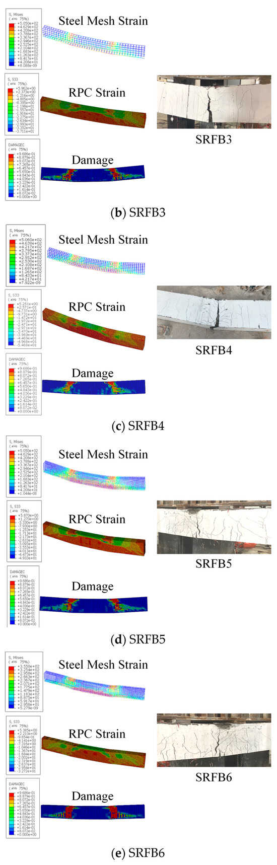 The results of the damage simulation of the reinforced thin layer of reactive powder concrete are shown in Figure 11, in which the crushed area between the two loading points in the damage cloud map is mainly concentrated in the loading point area, while the observed morphology in the experimental phenomenon is mainly in the mid-span region in the middle of the loading point. This is because the numerical simulation does not consider the case in which the two loading points are rigidly connected through the distributing beams, and the localized peeling of the reinforced thin layer during the crushing damage on the top of the beams at the later stage of the actual loading varies with the tie constraints of the numerical simulation.