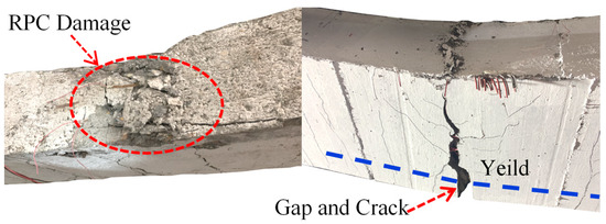 In the destruction stage, after the longitudinal reinforcement in the reinforcement layer at the bottom of the beam yields to tension, the plastic deformation of the section develops rapidly. The cracks continue to extend upward, and the width increases. Due to the bidirectional stress state of the reinforcing network and the bridging effect of the steel fibers, the adjacent vertical cracks are connected, the cracks bifurcate at the end, and the cracking part of the stress zone is distributed in a network with a dense and uniform distribution of cracks, in which the steel fibers in the main crack opening are pulled off. The load does not continue to increase; the longitudinal reinforcement of the reinforcement layer and original member at the bottom pull off and yield one after another, the deformation of the member continues to increase, the cross-sectional stress is redistributed, the stress in the top of the beam in the pressurized area increases rapidly, the concrete in the pressurized area collapses and deforms and expands, and the reinforced layer of reactive powder concrete crushes and spalls off.
