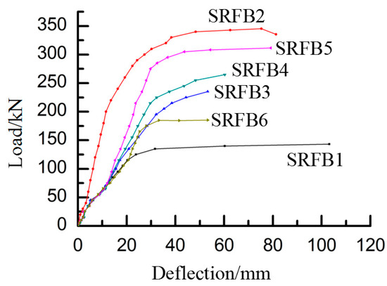 As shown in Figure 7, for the load–deflection curves, the slopes of the load curves in the elastic phase of the reinforced specimens increased to different degrees, indicating that the new steel reinforcement mesh and the reactive powder concrete material in the reinforced thin layer worked well together with the original members. The first inflection point of the slope of the curve appeared after the second stress cracking, the initial crack to the reactive powder concrete of the reinforced thin layer at the bottom of the beam stopped advancing, and the bridging effect of the steel fibers subsequently failed [29]. Afterward, the longitudinal reinforcement stresses in the reinforced layer continued to increase, the original longitudinal reinforcement and the newly added longitudinal reinforcement at the bottom of the beam reached one region after another, and the slope of the curve gradually decreased. When approaching the ultimate bearing capacity, the specimens with different initial load levels successively reached the yielding state of most longitudinal bars, the second inflection point appeared in the curve, the slope became significantly smaller or even close to the level, the load change was very small, the deflection began to change and increase abruptly, and the specimens reached a state of destruction, in which the deflection continued to increase most obviously after RCFB1 and SRFB6 reached the ultimate load.