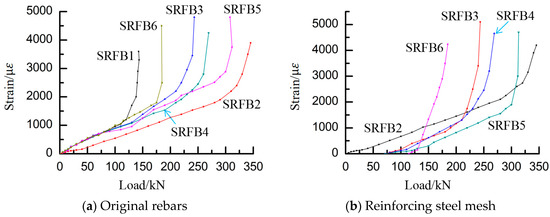 Under the condition of the same reinforcement layer reinforcement amount and different initial load-holding level conditions during secondary stressing, the difference in the strain of the longitudinal tensile reinforcement at the bottom of the specimen beams is obvious. SRFB2, SRFB5, and SRFB6 were configured with the same longitudinal tensile reinforcement at the bottom of the beams of the original members; therefore, the directions of the prestrain curves of the reinforcement were the same. Reinforcement is carried out after loading to a load level of 20% to 80% before secondary stressing, after which the reactive powder concrete, which has a lower load level, exhibits the first inflection point of the reinforcement strain curves. With the increase in the load level, the curves of SRFB5 and SRFB6 transit through the stage of linear elasticity change along the original slope, in which the slope of SRFB6, with a load level of 80%, has already begun to change, and the curves tend to be flattened, which indicates that the specimen was subjected to different degrees of plastic change in the late stage of initial stress, and some damage occurred in the bending region of the original member. After reinforcement by the reactive powder concrete reinforcing mesh reinforcement layer to share the load, the slope steepens and reverts to a linear change. The second prestress occurs over a long time in the elastic deformation stage, indicating that, at this time, the reactive powder concrete surface layer and longitudinal reinforcement in the reinforcing layer are operative and work with the original member. In the process of secondary stressing, the reinforcement in the reinforcement layer also experienced a change from elastic to final yield deformation. There is an initial strain difference between the longitudinal reinforcement in the original member and the longitudinal reinforcement in the reinforcement layer at the bottom of the beam, and the larger the initial load-holding level is, the larger the strain difference is, while the two reinforcement strain curves of the specimens finally converge, which indicates that the strain hysteresis phenomenon is gradually eliminated in the late stage of loading due to the deformation of the reinforcement in the reinforcement layer in the late stage of the secondary loading and the close to the state of the reinforcement after deformation in the primary loading. The reinforcement layer is the same as that of the original member, and damage and plastic deformation also occur. The reinforcement layer is damaged and plastically deformed, similar to the original member. In the figure, the strain difference of SRFB6 with a high initial load-holding level is the largest, which indicates that the strain hysteresis of the original member and the reinforcement layer is the most obvious. In the late loading stage, the strain curves of the longitudinal reinforcement in both the original member and the reinforced layer decrease rapidly, and the load increase is small, but the strain change is very large and rapid, indicating that the reinforcement is close to the yield state at this time. In the destructive stage after the linear elastic change in the late stage of the reinforcement, the slopes of the strain curves of the reinforcement in the reinforced layer and the reinforcement in the original member gradually decrease, the bending segment of the curves is very long, and a yielding plateau is experienced at the end. The co-stressing of the reinforced reactive powder concrete reinforcement mesh blocked the rapid yielding of the longitudinal reinforcement at the bottom of the beam of the original member, which improved the ductility, and the effect of ductility enhancement was more obvious in SRFB6 with a higher initial load-holding level.