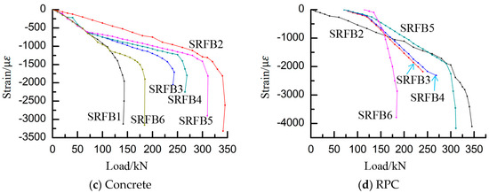 The compressive strain change curves of the original member concrete and reinforced reactive powder concrete in the compression zone at the top of the beam in Figure 9 show that the compressive strain values of the reinforced thin-layer reactive powder concrete are much greater than those of the original member concrete under the secondary stress state. Furthermore, the thickness of the reinforcement layer is only 25 mm, which indicates that the advantage of the ultrahigh strength of the reactive powder concrete has been fully realized. The reinforcing layers of the reinforcing beams SRFB2, SRFB5, and SRFB6 are 50 × 50 mm, and, in the late loading of the original component concrete and reactive powder concrete curve, the layers quickly reach the material’s ultimate compressive strain, and the specimen beam top compression zone material is damaged. Moreover, at 75 mm, the compressive strain curves of the original member concrete and reactive powder concrete ranged from 2000–2500 mm; that is, the compressive strain did not change, and the material did not reach a state of crushing. This shows that the material strength utilization efficiency of reactive powder concrete in the process of secondary force loading is different, in which the greater the amount of reinforcement in the steel reinforcement layer is, the more fully the reactive powder concrete exerts compressive strength in the compression zone.