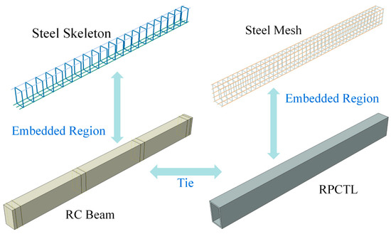 The general finite element software ABAQUS 2020 was used for finite element simulation, and each component was created and edited under the Part module (Figure 9). The original component concrete and reactive powder concrete were simulated with three-dimensional deformable solid units, and the reinforcing steel skeleton and reinforcing thin layer of the reinforcement mesh were simulated with three-dimensional deformable line units. The reinforced specimen models were generated based on the primary force to reinforce the thin layer, and then the secondary force holding load loading was realized through the method of living and dead cells. In the model, the concrete grid size of the original member was 50 mm, the grid size of the reinforcing skeleton of the original member was 50 mm, the cell size in the thickness direction of the reinforced thin layer of reactive powder concrete was 25 mm, and the cell size in the plane direction of the thin layer was 50 mm. The contact between the reinforcing mesh and the reactive powder concrete, as well as the contact between the reinforcing skeleton of the original member and the concrete, were all constrained using embedded constraints, and there was no interfacial slippage in the process of stress [31]. Memduh Karalar carried out a numerical investigation on the flexural response, and especially the crack failure, of rubberized concrete beams reinforced by waste tire rubber and plastic waste [32,33], where the boundary condition of no slip was set between the reinforced layer and the original member. Memduh Karalar used three-dimensional finite element mode shapes to study the flexural performance of concrete beams doped with WTR by defining the beam members as nonlinear frames, which provides a reference for the finite element analysis of the same type of composite-reinforced beams [34]. Tie constraints were used for the contact relationship between the RPC and concrete. Line constraints were used to simulate the boundary conditions [4], and the support constraints were set on the original concrete beams. One end was supported on a fixed hinge bearing, and one end was supported on a movable hinge bearing. The fixed-hinge constraints Dx, Dy, and Dz were all set to 0. The sliding-hinge constraints Dx and Dy were set to 0, but the displacement in the Z direction was not constrained.