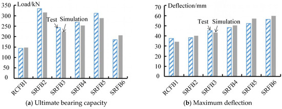 The numerical simulation results of the ultimate bearing capacity and maximum deflection are shown in Figure 10, and the comparison results show that the ratio of the test value to the simulated value of the ultimate bearing capacity of each specimen ranges between 0.927 and 1.087, and the ratio of the test values to the simulated values of the displacement ranges between 0.921 and 1.090, which is in good agreement with the test results.