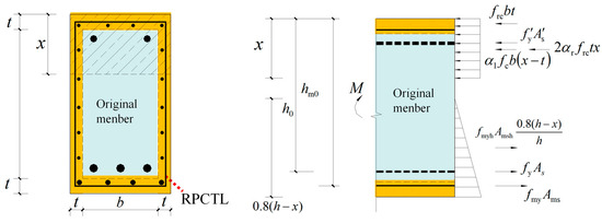 Considering that the side of the beam is subjected to tensile stress only within a certain height, the cross-sectional area reduction coefficient of the reinforcement is introduced to reduce the cross-sectional area of the longitudinal reinforcement, providing tensile stress in the thin layer of the beam side reinforcement [23]. According to the cross-sectional results of the ECC- and HDC-reinforced concrete beams, this coefficient is 0.8, and the longitudinal reinforcement in the thin layer of the beam side reinforcement does not reach the yielding of the longitudinal bars in its entirety. Therefore, the stress distribution of the tensile longitudinal reinforcement in the thin layer of the beam side reinforcement is regarded as a triangle with a linear change along the direction of the beam height and a height of 0.8(h − x), which reaches yielding near the bottom of the beam and is 0 near the side of the neutralization axis, and the point of the combined force is located in the center of the triangle at a distance of 0.8(h − x)/3 from the bottom of the beam. The height of the compression zone of the reinforced specimen x can be solved according to the cross-sectional force balance equation, in which the combined force of the concrete in the compression zone and the active powder concrete in the reinforced lamina on the side of the beam in the compression zone is equal to the combined force of the original longitudinal reinforcement at the bottom of the beam, the longitudinal reinforcement in the reinforced lamina at the bottom of the beam, and the longitudinal reinforcement in the reinforced lamina on the side of the beam in the range of the height of the beam at the bottom of the beam 0.8(h − x). The bending capacity of RPCTL-reinforced RC beams can be expressed as follows:
