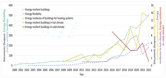 Appearance of the terms ‘energy resilient building’, ‘energy flexibility’, ‘energy resilience building for heating system’, ‘energy resilient building in hot climate’ and ‘energy resilient building in cold climate’ in the literature.