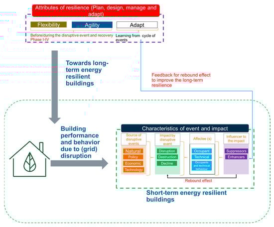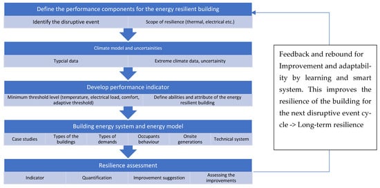 Energy-resilient building is an emerging concept that is increasingly used to represent the stable performance of buildings during power outages caused by extreme climatic-related events such as fire, extreme temperature storms, heavy rain, coastal erosion, and earthquakes. Most of the work has focused on energy flexibility, energy resilience of the electrical grids, and resilience as a broader concept and not considering the energy resilience of the building. Moreover, the earlier studies conducted on energy-resilient building are focused on short-term resilience [,,], which focuses on a single event and one disruption cycle. Therefore, a broader framework is needed that also discusses long-term resilience where the cascade effects and multiple cycles are considered during the lifetime of the building.