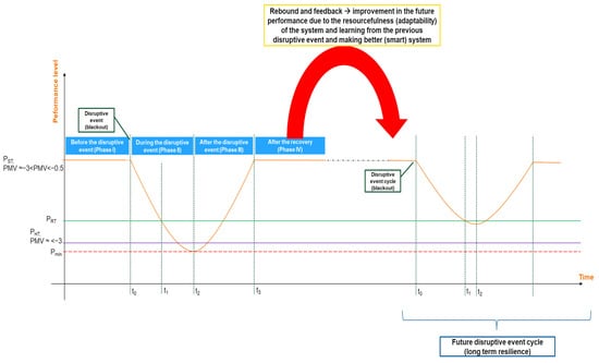 All the above phases are essential for short-term resilience. The novel part in the multi-disruptive event performance curve (Figure 4) is that it is extended with the rebound and feedback loop to introduce long-term resilience. For example, by learning from retrospective disruptive events, the building can be improved such as by improving the windows, using the onsite generation, storage (batteries) and smart controls (learning algorithms) to manage the building performance during a power outage.