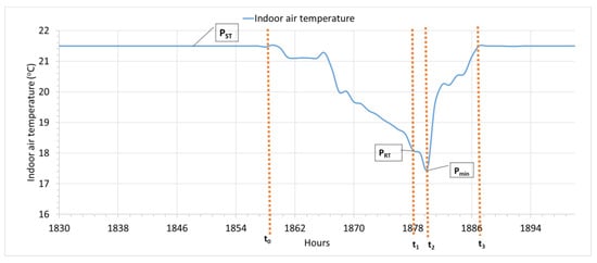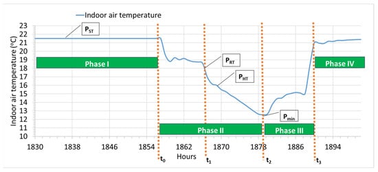 - Phase I ‘before the disruptive event’ (t < t0): Phase I is the state before the disruptive event. This stage can be called the preparation phase. In this stage, the building temperature, heating system and other energy systems operate at a normal state till a disruption such as a power outage occurs at t0. At this phase, the predicted mean vote (PMV) for thermal comfort can be around −3 < PMV < −0.5, as recommended by ASHRAE 55 [] for the heating season. It is important to note that PMV here represents suggested values and needs further analysis to define based on the climate and indoor conditions under disruptive events and level of dissatisfaction. The PMV for thermal comfort is based on the calculation given by Fanger [] and used for normal conditions (without considering disruption). At this stage, the building can be in the state of performance for demand response, flexibility control or preparation for energy resilience, depending on the objective and signals.