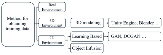 Research is being conducted to improve object recognition performance in construction sites by developing neural network-based architectures and by generating synthetic data. In [6,7], a network that predicts parameters like the center point, width, and angle of construction vehicles to detect them accurately and efficiently was proposed. Additionally, ref. [8] introduced a detection method based on the Enet neural network for identifying fenced at construction sites. The algorithm requires reconstruction to suit new objects, and network design also demands a significant variety of data. Thus, this study focused on generating synthetic data to improve recognition performance and conducted a literature review to explore this method. The construction of an AI training dataset is categorized as illustrated in Figure 2. It primarily involves two approaches: collecting data from real environments and generating virtual training data through synthesis. In the case of data collected from real environments, the process can be challenging due to the dynamic nature of the surroundings or the presence of hazardous conditions. Consequently, significant research is focused on the synthesis of data within virtual environments as a strategy to amass adequate training data, even under adverse conditions.