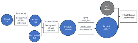The dataset utilized for the benchmarking training performance was captured through video recordings at the construction site. This study’s methodology and procedures are illustrated in Figure 1. In the initial phase, the frame scaffolding, identified as the object of interest, was segmented from its background using the real-world images acquired. In terms of the background, a comprehensive training dataset was developed by gathering photographs and videos that accurately depict the construction site’s atmosphere. These elements were then synthesized with the construction site backgrounds, integrating the isolated objects. This synthesized training dataset was further augmented using Roboflow, an advanced platform designed for image dataset management and enhancement of model development processes. Roboflow offers key features, such as image annotation, labeling, and augmentation. Following the augmentation, the enriched synthetic dataset underwent labeling and was processed using the YOLOv5 algorithm for training. The research included an analysis of the outcomes by modifying the proportion of synthetic to real data within the dataset, evaluating the dataset’s efficacy at various ratios. The structure of the remainder of this document is as follows. Section 2 engages in a literature review pertinent to training datasets. Section 3 details the methodology employed for generating a synthetic dataset specific to construction sites, encompassing strategies for data collection, synthesis, labeling, and augmentation. Section 4 outlines the results from the performance evaluation of the hybrid dataset. Section 5 concludes the document with a summary of our findings and their implications.