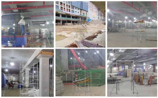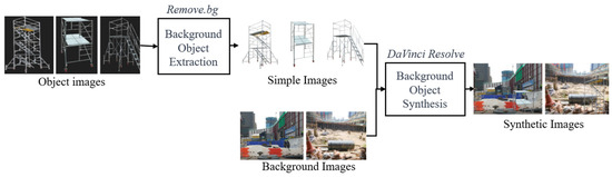 The synthesis of data is detailed in Figure 4. Initially, necessary data comprising construction site backgrounds and construction objects for synthetic data creation were compiled. Background data, representing construction sites, were sourced from photographs taken at actual sites. With regard to frame scaffolding, to ensure diversity reflective of actual construction site usage, datasets with redundant shapes were eliminated, favoring a collection of varied configurations. To enhance the diversity of object types, we utilized different types of scaffolding as objects. Figure 4 illustrates the method of generating synthetic data, where simple images depict scaffold images used for object synthesis. The background data consist of construction site images where scaffolding can be placed on the floor. Simplified images were produced by separating the backgrounds from the collected data using ‘remove.bg’, an AI-powered online service tool designed for automatic background removal from images. ‘Remove.bg’ is a free online tool that facilitates the quick and easy removal of backgrounds from objects. However, when removing backgrounds from scaffolding, which consists of thin lines, there is a high likelihood of improper separation if the color of the scaffolding closely resembles that of the background. Therefore, this study primarily utilized scaffolding data with white backgrounds. If an algorithm capable of effectively separating objects form their backgrounds is developed in the future, it could significantly enhance both realism and convenience. The total number of construction site background images collected was 302. Synthetic data were then generated by superimposing objects, from which backgrounds were removed, onto these images. This object insertion process utilized the ‘DaVinci Resolve’ software, version 18, renowned for its advanced image- and video-editing features.