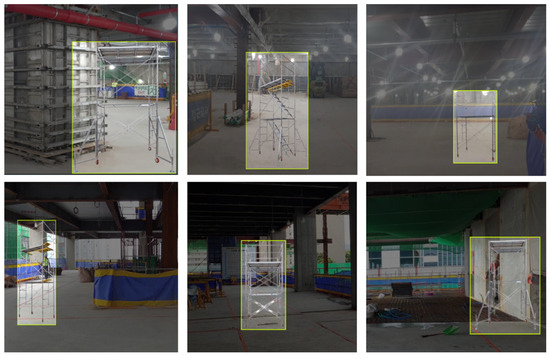 To evaluate performance, image data synthesized from construction sites and objects were annotated and labeled frame by frame using VOTT (https://github.com/microsoft/VoTT) (Visual Object Tagging Tool developed by the Commercial Software Engineering group at Microsoft in Israel), a freely available open-source software framework designed for image annotation and labeling. Figure 6 illustrates the labeled image data and the yellow box indicates synthesized frame scaffolding. After labeling 280 images using synthetic data, the dataset underwent an augmentation process in Roboflow. Securing data in various environmental conditions such as brightly lit or dark areas is essential. However, the labor required to acquire such data in the real world is significant. To overcome the challenges of obtaining diverse training data in realistic environments, adjustments in saturation, brightness, and exposure were made to enhance environmental diversity. Additionally, to further expand the dataset, augmentation techniques such as flip, crop, noise, and cutout were employed, with the augmented data displayed in Figure 7. The yellow box in Figure 7 indicates synthesized and augmented frame scaffolding. VOTT also enables the conversion of video data into image data, which are subsequently transformed into textual data via labeling. As a result, this process yielded 2000 frames of image data for scaffolding synthesis.
