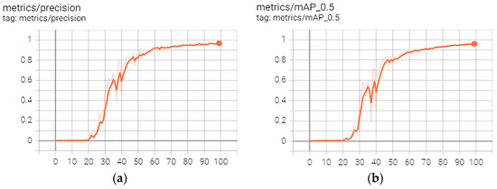 In this experiment, we tested the object-detection capabilities of the synthetic data. Table 4 presents the test results based on the dataset classification. The test revealed that the dataset comprised entirely of real data achieved the highest training performance, with a mAP of 0.989. In contrast, the dataset consisting entirely of synthetic data showed a lower performance, with a mAP of 0.518. Nonetheless, the YOLOv5 model’s performance can be improved by integrating real and synthetic data. Among the hybrid datasets, a ratio of 8:2 (synthetic to real) yielded better training results than a 5:5 ratio, with metrics nearing those of the real data. The performance metrics for a hybrid dataset (2 real/8 synthetic) are presented in Table 5. The results indicate an accuracy of 0.712, an F1-score of 0.830, a recall of 0.787, and a precision of 0.879. These metrics demonstrate the efficacy of integrating synthetic data with real data to train detection models. Figure 8 illustrates the test graph for the hybrid dataset (2 real/8 synthetic), including (a) the precision curve and (b) the mAP graph. In the graph, the light line shows the actual metric values at each step, while the bold line, which applies a smoothing factor of 0.6 to reduce short-term noise and exceptional fluctuations in the data. Both (a) precision and (b) mAP values saw significant improvement after 20 epochs, stabilizing at 1 after 70 epochs.