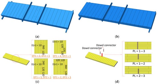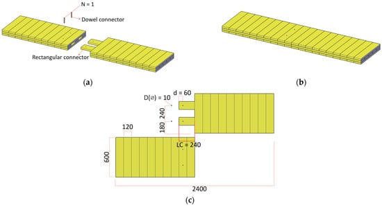 Based on the proposed two self-developed adhesive-free edge connections (the DS and the HL edge connections), the other eighteen models were generated by modifying different parameters. Therefore, twenty models in total were numerically studied using the validated variables and material properties based on the numerical model AFCLTP1. All the examined parameters are listed in Table 2. The definitions and illustrations of the parameters LC, D, N, d, and TB are provided in Section 2.1. Additionally, 2c means two rows of dowel connectors with a closer distance (Figure 6b) than that of ‘1-240-10-2-60-1—3’, where the distances between the rows of the former and latter were 40 mm and 120 mm. PL expresses the penetrated layers (top layer—transverse layer—bottom layer/1-2-3). DT1 (dowel type 1) is the number of dowels on one row, and DT2 (dowel type 2) is the row number of dowels (Figure 6c). Furthermore, the models involved in the same comparison group belonged to the same parameter’s modification. Hence, the original two models (‘1-240-10-1-60-1—3’ and ‘2-480-2-1-45-240’) were included in all ten comparison groups.