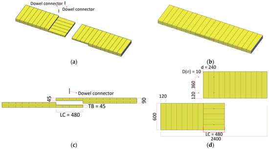 There are two proposed adhesive-free edge connections in this study, which are made of standard timber and compressed dowelled wood. The material and mechanical properties of the CLT panel and compressed dowel are presented in Section 2.3, which are the same as the validated numerical model. Those two developed edge connections were designed to connect two CLT panels in their weak directions. The studied CLT panels are composed of three lamella layers with a thickness of 30 mm at each layer. Meanwhile, each lamella layer was made of multiple parallelly placed lumbers with the cross-section dimensions of 120 mm × 30 mm (width × thickness), and the top and bottom layers (longitudinal layers) were perpendicular to the second lamella layer (transverse layer). The first edge connection, the double surface (DS) connection, was composed of two compressed wood dowel connectors (a diameter D of 10 mm and length of 90 mm) and two rectangular lumbers that were extended from the CLT panel’s lamella layers (Figure 1). The DS edge connection has a longitudinal length of 240 mm (LC) and a thickness of 30 mm. The CLT panels were connected, beginning by placing the rectangular connectors from one panel into another CLT panel along the horizontal direction. Then, the dowel connectors were vertically inserted into the CLT panels in one row (N), which also fixed the rectangular connectors. In addition, d presents the distance between the dowel’s pith and the end edge of the panel, which is 60 mm.