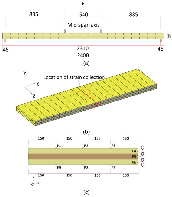 Four-point bending test setup: (a) connected panels with boundary conditions, (b) location of strain’s collection points, and (c) section view at panel’s mid-span (dimensions are in mm).