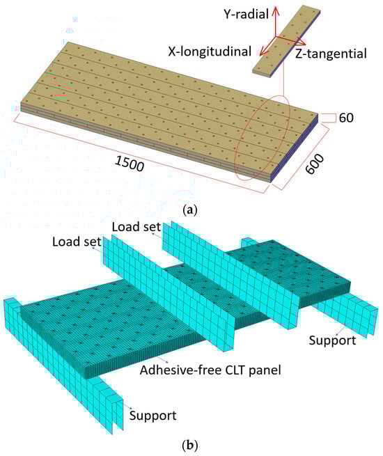 The numerical model’s setup, material properties, and environmental variables were verified by simulating an existing experimental test, which was implemented by Sotayo et al. []. As Figure 4 illustrates, the experiment was on an adhesive-free CLT panel with the dimensions of 1500 mm × 600 mm × 60 mm (length × width × thickness). The panel’s lamella layers were joined by using the dowel connectors, which were made of compressed beech (diameters of 10 mm and a length of 60 mm). The panel’s lamella layers were composed of multiple lumbers with an identical cross-sectional dimension of 115 mm × 20 mm (width × thickness), and the orientations of each lumber are illustrated in Figure 4a. The lumber was made of Scots pine with a mean density of 556 kg/m3 and moisture contents of 10–15%. According to the experiments, the compressed dowels (beech) have a density of 1300 kg/m3, an elastic flexural modulus of 25 GPa, moisture contents of 5–8%, and a flexural strength of 269 MPa. The compressed dowels were produced by employing radial compression with a ratio of 54% []. The materials of the standard wood and compressed wood from the existing experiment were employed in the numerical simulation for both the validation models and the models with self-developed edge connections. Besides, the mesh size was set to 10 mm after the convergence study (element type: C3D8R, an eight-node linear brick, reduced integration, hourglass control), and the meshed finite element model included 94,920 elements. Furthermore, the numerical analysis was implemented through the static type with the minimum increment size of 5 × 10−6. In the experimental test, the CLT panels without joints were also investigated under a four-point bending test, in which the flexural modulus, strength, and maximum reaction force ranged from 11.1–13.5 GPa, 44.2–55.2 MPa, and 59.8–74.9 kN, respectively. The ratio of the CLT panel’s flexural strength with and without the joint is 0.49 (23.6 MPa/48.6 MPa).