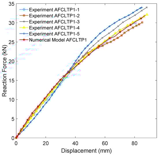 According to the experiment test from Sotayo et al. [], the adhesive-free CLT panel AFCLTP1 was experimentally tested five times with identical test conditions, material, and specimen geometry. Meanwhile, the load–displacement curves obtained from these five tests performed different elastic and yield behaviors as well as their ultimate moments. Therefore, the results of all five tests, the mean ultimate load, and the mean displacement at failure were all used to validate and verify the developed numerical model. Figure 5 depicts the comparison of the experimental tests and numerical modeling based on their load–displacement diagrams. The average load capacities derived from the five existing experiments, AFCLTP1 (1–5), as well as the developed numerical models, were determined to be 32 kN and 31.96 kN, respectively. The mean rotations associated with the load capacities observed in the AFCLTP1 experiments and numerical models were measured at 85.4 mm and 87.1 mm, respectively. Notably, the numerical model exhibited a slightly lower load capacity (−0.1%) and a greater deflection at failure (1.9%) in comparison to the experimental test. Meanwhile, the elastic and yielding behaviors of the numerical model were relatively close to that of the experiment tests. Consequently, it can be inferred that the numerical model successfully predicted the behavior and load capacity of the beam-to-beam connection with a commendable level of accuracy.