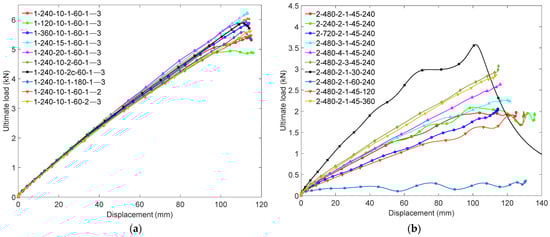 Load–displacement responses: (a) comparison groups 1–5 and (b) comparison groups 6–10.