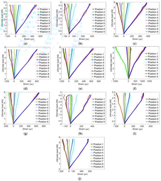 Load–strain diagrams under four-point bending test: (a) 2-480-2-1-45-240, (b) 2-240-2-1-45-240, (c) 2-720-2-1-45-240, (d) 2-480-3-1-45-240, (e) 2-480-4-1-45-240, (f) 2-480-2-3-45-240, (g) 2-480-2-1-30-240, (h) 2-480-2-1-60-240, (i) 2-480-2-1-45-120, and (j) 2-480-2-1-45-360.