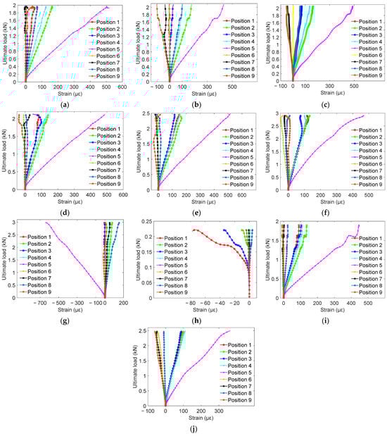 Load–strain diagrams under four-point bending test: (a) 1-240-10-1-60-1—3, (b) 1-120-10-1-60-1—3, (c) 1-360-10-1-60-1—3, (d) 1-240-15-1-60-1—3, (e) 1-240-20-1-60-1—3, (f) 1-240-10-2-60-1—3, (g) 1-240-10-2c-60-1—3, (h) 1-240-10-1-180-1—3, (i) 1-240-10-1-60-1—2, and (j) 1-240-10-1-60-2—3.