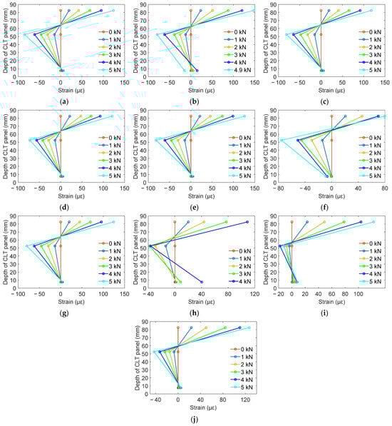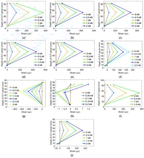 Strain distribution over connected CLT panel’s height at mid-span: (a) 1-240-10-1-60-1—3, (b) 1-120-10-1-60-1—3, (c) 1-360-10-1-60-1—3, (d) 1-240-15-1-60-1—3, (e) 1-240-20-1-60-1—3, (f) 1-240-10-2-60-1—3, (g) 1-240-10-2c-60-1—3, (h) 1-240-10-1-180-1—3, (i) 1-240-10-1-60-1—2, and (j) 1-240-10-1-60-2—3.