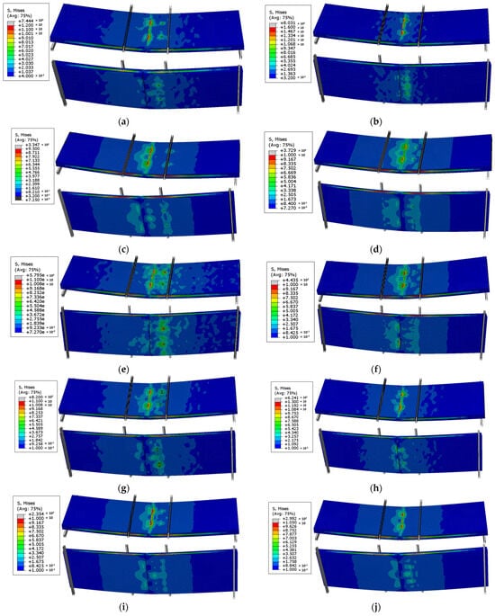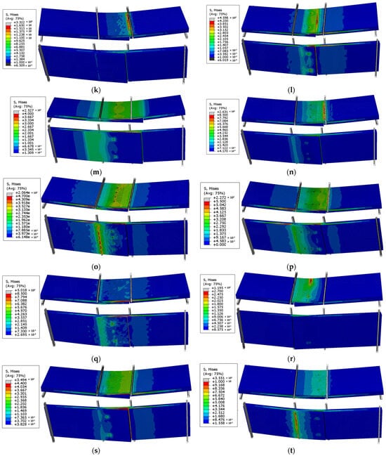 Contours of von Mises stress and failure mode for CLT panels with DS or HL edge connections: (a) 1-240-10-1-60-1—3, (b) 1-120-10-1-60-1—3, (c) 1-360-10-1-60-1—3, (d) 1-240-15-1-60-1—3, (e) 1-240-20-1-60-1—3, (f) 1-240-10-2-60-1—3, (g) 1-240-10-2c-60-1—3, (h) 1-240-10-1-180-1—3, (i) 1-240-10-1-60-1—2, (j) 1-240-10-1-60-2—3, (k) 2-480-2-1-45-240, (l) 2-240-2-1-45-240, (m) 2-720-2-1-45-240, (n) 2-480-3-1-45-240, (o) 2-480-4-1-45-240, (p) 2-480-2-3-45-240, (q) 2-480-2-1-30-240, (r) 2-480-2-1-60-240, (s) 2-480-2-1-45-120, and (t) 2-480-2-1-45-360 (units are in MPa).