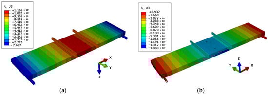Figure 13 provides the ultimate deflection distributions of two deformed numerical models, ‘1-240-10-1-60-1—3’ and ‘2-480-2-1-45-240’. It was seen that the panel with a DS edge connection showed symmetrical deflection along the longitudinal direction based on the mid-span edge. A similar performance was also perceived on the panel with the HL edge connection, except for the bottom layer between the load sets. Therefore, the maximum deflection of the model with the HL edge connection on the Z-direction was obtained from the lower panel’s edge instead of the connected panel’s midpoint (1-240-10-1-60-1—3). This was because the half-lapped part of the lower panel was not constrained by its edge, which also indicated that this part was barely deformed. Among those two models, the panels’ deflections from the load set to the supports were linearly decreased, which was expected because the panels’ two outer sides were fixed against the Z-direction.
