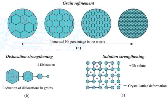 Strengthening mechanisms due to Nb addition: (a) grain refinement, (b) dislocation strengthening, and (c) solution strengthening.