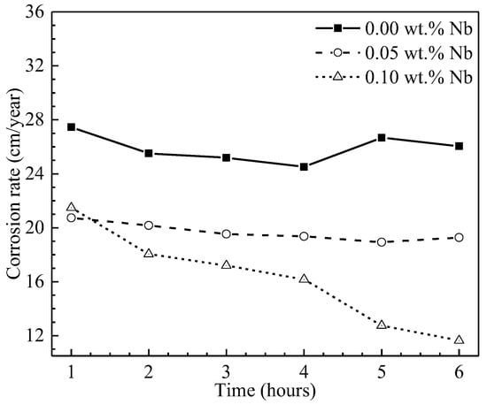 The parameter commonly used to evaluate corrosion resistance is the corrosion rate, frequently expressed in millimeters per year. This parameter is indirectly determined since it is necessary to experimentally quantify other variables, such as the mass loss or thickness reduction. The corrosion rate can also be determined from electrochemical techniques, for example, via the potentiodynamic polarization technique []. In the literature, various corrosive environments have been evaluated, including sulfuric acid, NaCl, and CO2-polluted saline atmospheres. Specifically, Nam and Kim [] assessed the effects of adding 0.05 and 0.10 wt.% niobium on the corrosion resistance of low-alloy steel exposed to a 10 wt.% sulfuric acid solution. It was found that increasing the Nb content promotes the decrease in the passive current within the corrosive environment. The researchers attribute this tendency to the fact that the Nb present in the steel creates an oxide layer that protects its surface, thus inhibiting the steel dissolution. The addition of 0.05 and 0.10 wt.% Nb reduced the corrosion rate by 28% and 54%, respectively (see Figure 4).