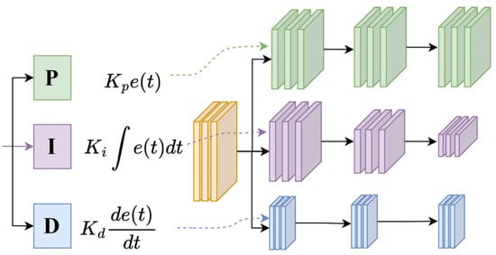 The PID algorithm’s application within early-stage industrial control often necessitates manual parameter adjustments in response to feedback, a process exemplified in scenarios such as rotating inverted pendulums and balance cars. Addressing this, our approach integrates the proportional–integral–Differential parameters (kp, ki, kd) as learnable components within the CNN architecture, allowing for automatic adjustment in relation to network loss. Through Equation (2) during forward propagation, kp, ki, and kd are transformed into kp′, ki′, and kd′, respectively, ensuring parameter tuning remains within an optimal range to enhance feature interpretation across the three branches.