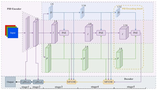The architecture of the PID-MHENet network is illustrated in Figure 2. It employs an encoder–decoder framework comprising a PID encoder, a decoder, and a skip connection organized into five stages (stage 1 to stage 5). The PID encoder features a unique three-branch structure: proportional, integral, and differential branches. Initially, in stage 1, the input image undergoes a convolution operation to extract shallow features. This is followed by downsampling and further convolution in stage 2. Subsequently, the process advances through the PID encoding blocks in stages 3 to 5. Each block is dedicated to encoding different types of information: semantic, contextual, and detail, enhancing the network’s ability to capture and integrate varied information streams. The PAE module further augments contextual information by integrating details and semantic insights, thereby enriching feature representation.