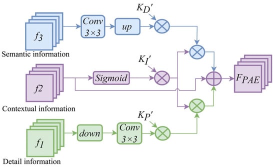 Figure 3 unveils the PAE module, innovatively applying the PID algorithm’s three-channel regulation concept to bolster feature fusion. This module enriches contextual understanding by leveraging the proportional branch’s detailed information and the differential branch’s semantic insights, addressing the original network’s limitation in deep contextual information extraction. The process begins with the detail information feature map (f1) undergoing downsampling and a 3 × 3 convolution for preliminary extraction. Similarly, the semantic information feature map (f3) is processed through a 3 × 3 convolution and upsampling. The contextual information feature map (f2) is then refined via a Sigmoid function. Subsequently, each branch’s feature map is scaled by the corresponding kp′, ki′, and kd′ tuning parameters, culminating in a composite feature map through element-wise summation and fusion with the original contextual data, resulting in the output FPAE.