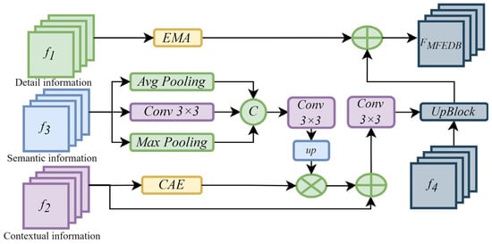 The introduction of feature maps with disparate resolutions through a three-channel skip connection inadvertently introduces excess redundant information. Traditional decoding blocks, which primarily rely on direct upsampling without integrating features across various scales and depths, often falter in accurately segmenting pixels amid similar backgrounds, edges of defects, and minute lesions. As shown in Figure 4, the global feature fusion strategy of MFEDB can segment the above pixels more effectively. It employs an Efficient Multiscale Attention (EMA) [] module for the downsampled scale branch feature map (f1), producing an enhanced detail feature map (Fch1). Concurrently, the differential branch feature map (F3) undergoes channel splicing post-average pooling and 3 × 3 convolution, followed by maximum pooling and further 3 × 3 convolution, leading to the upsampled, enhanced semantic feature map (Fch3), as delineated in Equation (3).