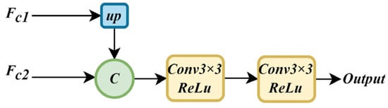 Subsequent operations include a pixel-level dot product between Fch3 and the integral branch feature map (f2), processed via the CAE module, with an addition of f2 to fuse semantic with contextual information. A 3 × 3 convolution then extracts the amalgamated feature set to produce fm (as per Equation (4)). The final enhanced feature map (FMFEDB) emerges from upsampling, splicing, and decoding operations with f4 via UpBlock, integrated with Fch1 to refine the detailed feature map with additional information, encapsulating contextual, semantic, and detail facets (Equation (5)). The structure of UpBlock is shown in Figure 5.