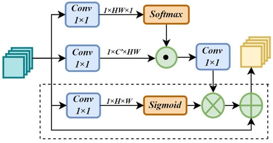 The CAE module introduces a focused strategy to accentuate critical feature information within the contextual feature map, leveraging global spatial context to amplify feature representation. Incorporated atop the foundational GCNet module [], the CAE introduces an additional pathway (highlighted in the dashed box in Figure 6) for pixel informativeness learning, merging local and global features while clarifying informational overlap. The spatial context of each pixel is aggregated through Equation (6), with Pi and Qi representing the input and output feature mappings for layer i, incorporating Ni pixels. The transformation matrices wk and wv project these mappings, while ai—a reweighting matrix—modulates the aggregated spatial context intensity per pixel, utilizing softmax for linear transformation of the Pi matrix (Equation (7)). Practical implementation involves 1 × 1 convolutions for matrix mapping, followed by pixel-level dot product operations and summation with original feature maps, facilitating a nuanced feature map amalgamation.