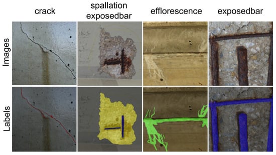 In this paper, a multi-defect semantic segmentation dataset of concrete bridges containing four types of apparent defects, namely crack, efflorescence, spallation, and exposedbar, is established. The original images for the dataset came from public datasets [,,]. They were then annotated using the Pixel Annotation Tool, a segmentation dataset annotation software which ultimately yielded 2842 images with identified defects. The dataset was randomly split into training and testing sets in a 9:1 ratio with a fixed random seed to ensure consistency across different network experiments. The dataset pictures and truth labels are shown in Figure 7, in which the spallation defect, which is the result of concrete peeling off, may also form the exposedbar in the end, making a variety of defects in the same location. The efflorescence defect is shown as a white color, flaky distribution. The exposedbar defect is shown as the exposed steel reinforcement or corrosion, while the crack defect is mostly distributed in the form of irregular lines, with a thin and slender distribution accounting for the total area of the picture being relatively small.