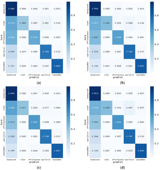 The following evaluates the performance of each module through a confusion matrix heatmap, as shown in Figure 8. In the heatmap matrix, each row represents the predicted proportion of pixels for various types of defects, and each column represents the actual proportion of various defects in the data. The larger the numbers on the diagonal, the more pixels are accurately segmented. It can be observed that Experiments 2 to 4 have larger numbers on the diagonal than Experiment 1, with Experiment 4 having the largest diagonal numbers.