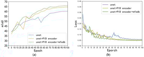 On the other hand, the mIoU and loss values of each round of test set were recorded during model training, as shown in Figure 9. It can be seen that the mIoU value and loss value fluctuated up and down between epochs of 0–50, a phenomenon which may be caused by the fact that the network does not learn enough prior knowledge during the pre-training. As the training progressed, the advantages of the PID encoder and MHEDB module started to emerge after 50 epochs. After 80 epochs, the network mIoU value and loss value area stabilized, and the PID-MHENet network attained the highest mIoU value and the lowest loss value, further proving the effectiveness of each module of the network and the excellent segmentation performance of the network.