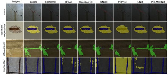 In Table 8, we observe significant enhancements in Intersection over Union (IoU) values for four distinct defects—efflorescence, spallation, exposedbar, and crack—when employing the PID-MHENet over the UNet network. Specifically, IoU improvements were 10.24%, 4.6%, 4.09%, and 7.69%, respectively, with efflorescence showing the most notable increase. Additionally, mean Pixel accuracy (mPa) and mean IoU (mIoU) values increased by 5.17% and 5.46%, respectively, against the UNet benchmark. Comparatively, against the Segformer network introduced in 2021, the defects’ IoU values saw enhancements of 8.83%, 12.58%, 13.31%, and 19.57%, respectively, with the crack defect attaining the greatest improvement. The mPa and mIoU metrics also improved by 12.64% and 11.04%, respectively.
