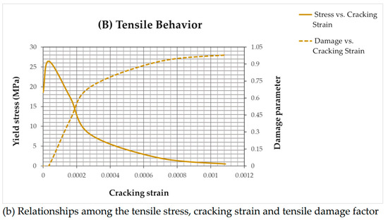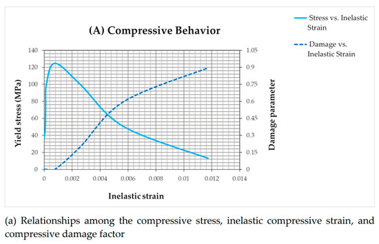 The Concrete Damage Plasticity (CDP) [16] model embedded within the Abaqus software has demonstrated remarkable efficacy in prognosticating concrete deterioration amid touch-off explosion scenarios, as corroborated by antecedent research endeavors. This model adeptly accommodates the intricate nonlinearities inherent to concrete materials, encompassing the evolution of damage and structural failure by amalgamating plasticity theory with damage mechanics. Fundamentally, the CDP model conceptualizes concrete as a substance capable of manifesting both elastic and plastic deformation, with damage propagation being contingent upon stress levels. To address the influence of strain rate fluctuations in dynamic scenarios, dynamic increase coefficients (DICs) are integrated into the CDP framework. In this specific work, the amplification of DICs induced by the influence of strain rate was meticulously regulated and upheld at a consistent level. The calibration procedure involved an initial application of static reference mechanical attributes, which were subsequently fine-tuned to align seamlessly with experimental observations. Despite the inherent simplifications, the outcomes derived from this methodology closely align with findings from antecedent research on concrete specimens [1,5,36], where DIC values pertaining to compressive strength (fc), tensile strength (ft), and Young’s modulus (Ec) typically reside within the range of 3 to 6. Table 3 encapsulates the resultant dynamic properties alongside their corresponding DIC values, while acknowledging the constant nature of the DIC throughout the analysis. Figure 5 illustrates the relationship curves displaying the calibrated final values of the CDP constituent model.