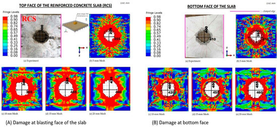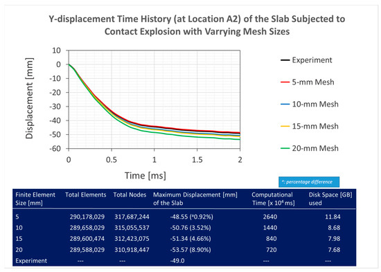 Alterations in the element size prompt divergent responses within the slab, as illustrated in Figure 6. For instance, employing a 5 mm dimension yields a maximum deformation of 48.55 mm, representing a mere 0.92% deviation from experimental observations. Conversely, the utilization of a 20 mm size results in a more pronounced deformation of 53.57 mm, indicating a significant 9.32% increase compared to experimental findings. Intermediate gradations elicit moderate distortions, culminating in peak distortions registering at 50.76 mm (roughly 3.59% in excess of test values) and 51.34 mm (approximately 4.77% higher than test values), respectively. Consequently, a 5 mm size proves optimal, closely simulating the slab’s behavior under blast conditions with minimal variance. Notably, location A2 in Figure 6 corresponds to the centroidal position of the slab’s upper surface, aligning with the region examined in the referenced Study [3]. Additionally, damages observed on the slab, including crack sizes and perforations detailed in Figure 7, closely mirror findings in Reference [3]. Stressing precision, the present study underscores the necessity of employing a 5 mm size for accurate results. It is imperative to emphasize that the slight disparities observed between experimental and computational findings stem from multifaceted factors, encompassing idealizations inherent in material modeling, boundary conditions, and the omission of weather-related effects from consideration.