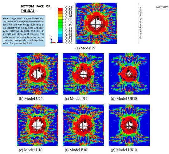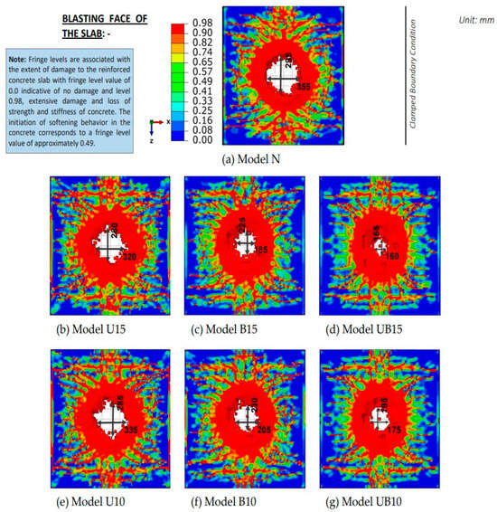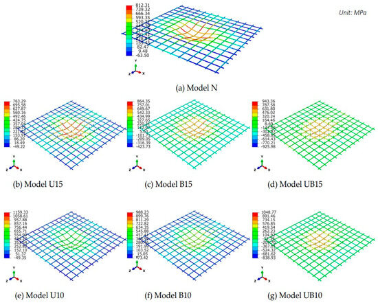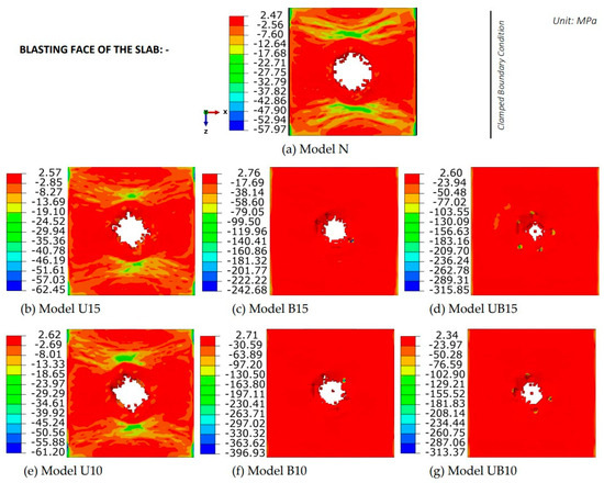 In Figure 9, the pinnacle values of tensile stress within the steel reinforcement at the affected area vary among the slab configurations, with Model N exhibiting the highest stress level at 812.31 MPa. Conversely, the incorporation of studs in Model U15, particularly affixed to the upper-layer bars, yields a decrease in tensile stress, to 763.29 MPa. Similarly, Model B15, featuring studs welded to the lower-layer bars, showcases a further reduction in stress, to 649.67 MPa, thus emphasizing the efficacy of support at the bottom layer. Model UB15, characterized by studs on both upper and lower layers, demonstrates a notable decline in tensile stress, to 631.80 MPa, indicative of the synergistic impact of combined support mechanisms. Similarly, in Models U10, B10, and UB10, the diminished tensile stress levels (756.44 MPa, 722.82 MPa, and 734.15 MPa, respectively) compared to Model N underscore the pivotal role of studs in redistributing and alleviating impact loads. This reduction in stress is ascribed to the enhanced dispersion of loads, the augmented bonding of reinforcement, and the reinforcement of concrete facilitated by the studs, collectively enhancing the structural robustness and resistance to contact-explosion loading of the slabs. Finally, it is noteworthy of mention that the stresses observed in the concrete of the slabs with studs follow a similar trend as observed in the deformations, as shown in Figure 10 and Figure 11. Furthermore, the stresses detected in the concrete correlate with the computed damage pattern.