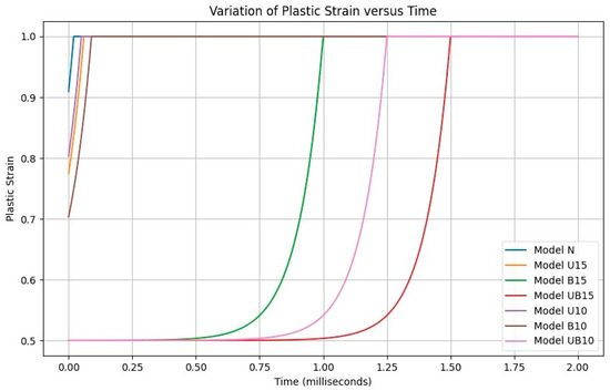 In Figure 12, in Model N, the absence of studs results in a progressive increase in plastic strain within the concrete over time, culminating in maximal deformation induced by the contact explosion. Perforation begins relatively early, commencing at around 20 microseconds, and swiftly advances, causing extensive damage characterized by sizable perforations. Conversely, in Model U15, where studs are affixed to the upper-layer bars, the evolution of plastic strain follows a similar trajectory, albeit with marginally reduced deformation attributed to the supplementary reinforcement offered by the studs. Perforation onset is delayed, occurring at approximately 60 microseconds, indicative of a postponed structural failure facilitated by the presence of studs, thereby resulting in diminished perforation sizes compared to Model N. Conversely, in Model B15, featuring studs solely on the bottom-layer bars, the escalation of plastic strain transpires more gradually, reflecting the enhanced load distribution and support provided by the bottom-layer studs. Perforation initiates at 1 s, illustrating the efficacy of the bottom-layer studs in retarding structural failure and mitigating the extent of damage. Meanwhile, in Model UB15, equipped with studs on both upper and bottom layers, the evolution of plastic strain exhibits a further reduction in deformation and postponement of perforation onset. Perforation emerges at 1.5 s, substantially later than in Models N and U15, underscoring the augmented resistance to deformation and structural integrity conferred by the combined reinforcement from both layers of studs. Similar patterns are discernible in Models U10, B10, and UB10, where the height of the studs influences the degree of deformation and reduction in perforation size. In summary, the integration of studs, particularly on both upper and bottom layers, fortifies the slab’s resilience against deformation and perforation, thereby enhancing its resistance to contact-induced explosions.