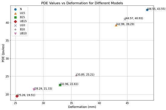 In Figure 16, the graph depicts the correlation between PDE and deformation across multiple models, each distinguished by a unique marker symbol and color. Elevated PDE values correspond to heightened plastic deformation, indicative of increased structural compromise under impact conditions. Notably, Model UB15 showcases the lowest PDE, despite enduring substantial deformation, highlighting its remarkable resilience. This outcome resonates with the technical rationale driving the inclusion of studs in the slab configuration. The incorporation of studs serves to optimize load dispersion, fortify the structural integrity, and defer the onset of perforation, culminating in diminished plastic dissipation energy. As a result, models featuring studs (UB15 and UB10) exhibit superior damage mitigation compared to their studless counterparts (N, U15, B15, U10, and B10), underscoring the efficacy of stud integration in enhancing structural durability against impact loading scenarios.