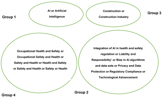 We conducted a search using specific keywords related to AI, occupational health and safety, the construction industry, and socio-legal aspects, guided by our research questions. These keywords were based on the socio-legal issues identified in Section 2, which were narrowed down to the construction industry discipline. The search keywords were divided into four categories. The first category was related to artificial intelligence, the second category focused on the [identified] socio-legal issues, the third category was specific to the construction industry, and the fourth category centred around health and safety. Figure 2 presents a visual representation of these categories.