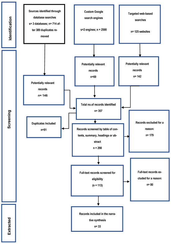 A plan was created to search for grey literature that included two different searching techniques: (1) searching through grey literature databases, and (2) using customised Google search engines. These complementary strategies were used to minimise the risk of omitting relevant sources. Each database and search engine utilise unique algorithms to generate their relevance rating schemes, and using a variety of these sources is likely to result in a more extensive search. It is essential to document every stage of the grey literature search process to maintain transparency and comprehensiveness. Therefore, all assumptions, decisions, and challenges encountered throughout the review were recorded.