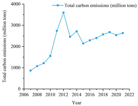 Utilizing the aforementioned calculation method, carbon emissions in the five regions were computed for the period spanning from 2007 to 2021. The outcomes are illustrated in Figure 1. The analysis reveals that the period from 2007 to 2021 can be delineated into three distinct phases: an ascending phase (2007–2012), a descending phase (2013–2015), and a stabilized phase (2016–2021). This is almost consistent with the analytical results obtained by Zhou et al. [].