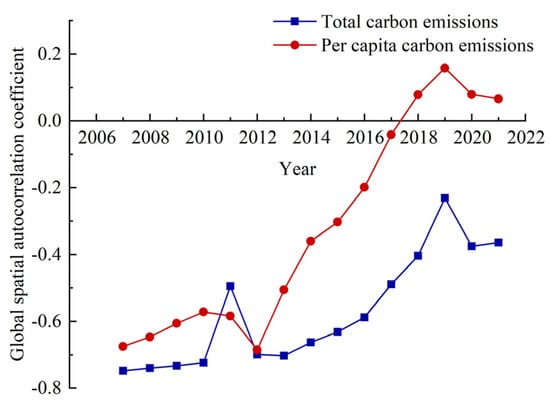 The Moran’s I index varies from [−1, 1]. Values larger than 0 indicate a positive correlation, with larger values indicating a stronger correlation. Conversely, values less than 0 signify a negative correlation, with smaller values indicating greater spatial disparity [].